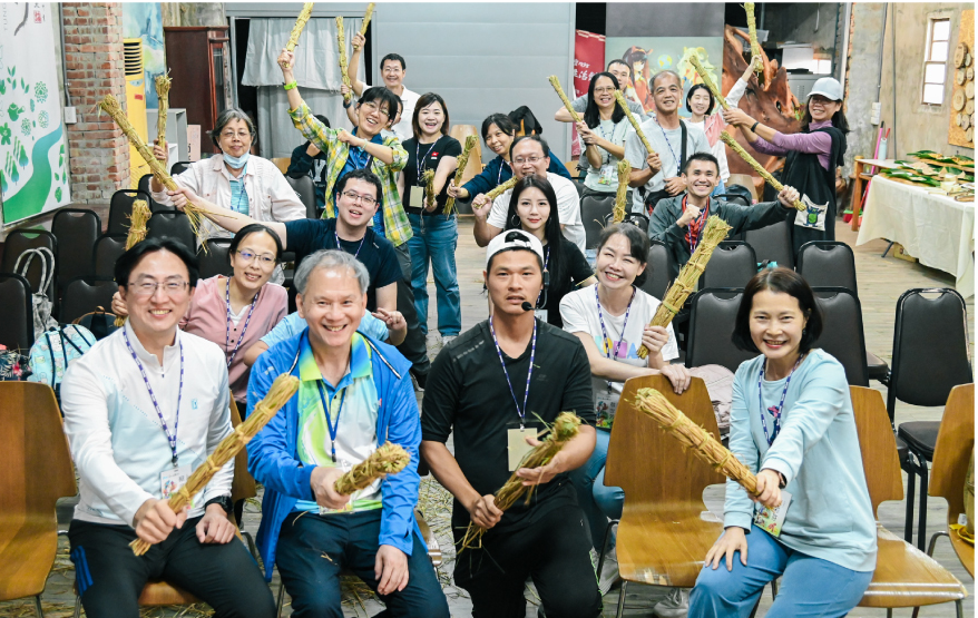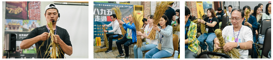 來到草編體驗的教室裡,移居銅鑼多年的青農楊振誠(阿誠)帶來另一場與土地的對話。他談起每天在田間看見的昆蟲、風聲與作物變化,也分享他為何選擇以友善環境的方式耕作。延續這份理念,阿誠教大家以自家種植的無毒稻梗製作「拍打棒」,從梳理、旋轉、綁繞到成形,志工在手作節奏中理解農作背後的耐心,也在雙手的觸感裡建立起自身與自然、文化和永續的連結。
