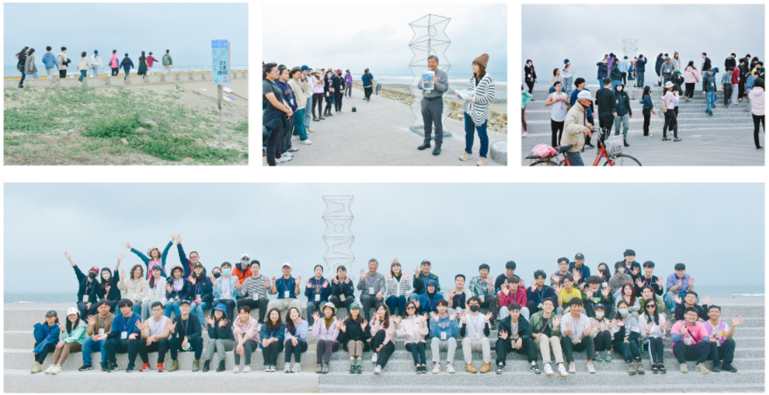 淨灘回程,給予志工夥伴開啟感官、沉澱心靈與土地對話的空間,一行人靜靜漫步海堤,沐浴海風、細聽浪濤、嗅聞海味……,途經地景藝術「魚筌意象」,是112年「苗南海地景藝術節」創作作品之一,策展人邱泰洋老師本身即是苑裡人,為感謝大地志工參與淨灘活動的心意,百忙之中,仍抽空現身為大家導覽;並邀請「魚筌意象」作者邱欣儀現地分享創作理念:將漁村生活的日常,透過對魚筌的想像,編織出一座富現代感的藝術造型,讓觀者閱讀作品的同時,彷彿也能聽見海的聲音,聞到海的味道。當陽光灑落、穿透過網子的稜線,如漫步在沙灘送別夕陽西下,豐收返家的漁民,是一幅多麼溫馨幸福的畫面。作者也邀請大家在不同時節前來欣賞,感受作品融入大海與光影之間自然變化的獨特景致。