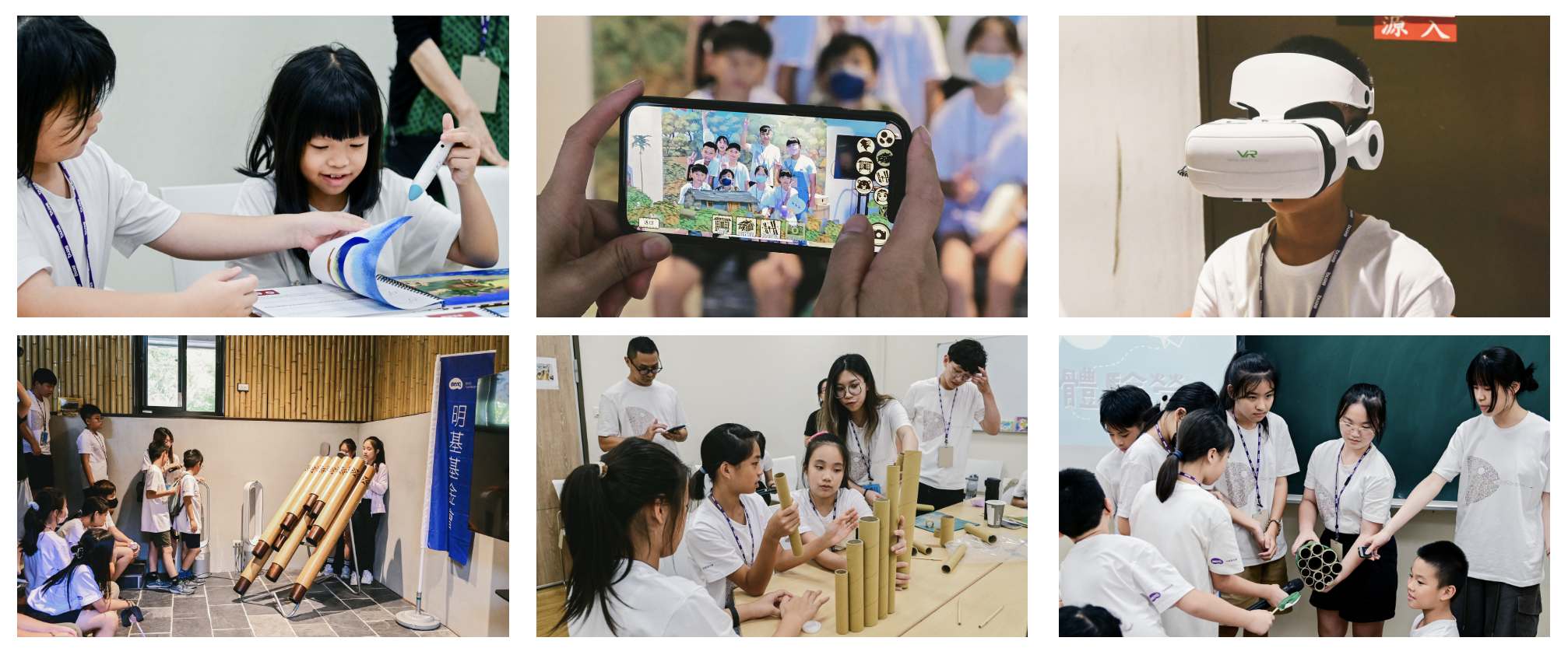 「吉娃斯愛科學」課程, 透過科普動畫及點讀筆繪本,傳遞原民先人的生活智慧與族語故事;在融合原住民族傳統竹工藝與現代化鋼構的「竹屋」中,帶領孩子們體驗到 AR 擴增實境,驚喜地看見動畫中的主角吉娃斯及她的寵物猴子乃奈在眼前活靈活現,更在 VR 虛擬實境中,走進平常無法接觸的原住民社群,沉浸式地體驗到他們的生活方式。此外, 探索阿美族特有的傳統樂器「旮亙」,在觀察不同長短構造所創造出的多樣音高和音色後,親手復刻此樂器及即興創作樂曲,充分展現創造力與藝術表達能力。