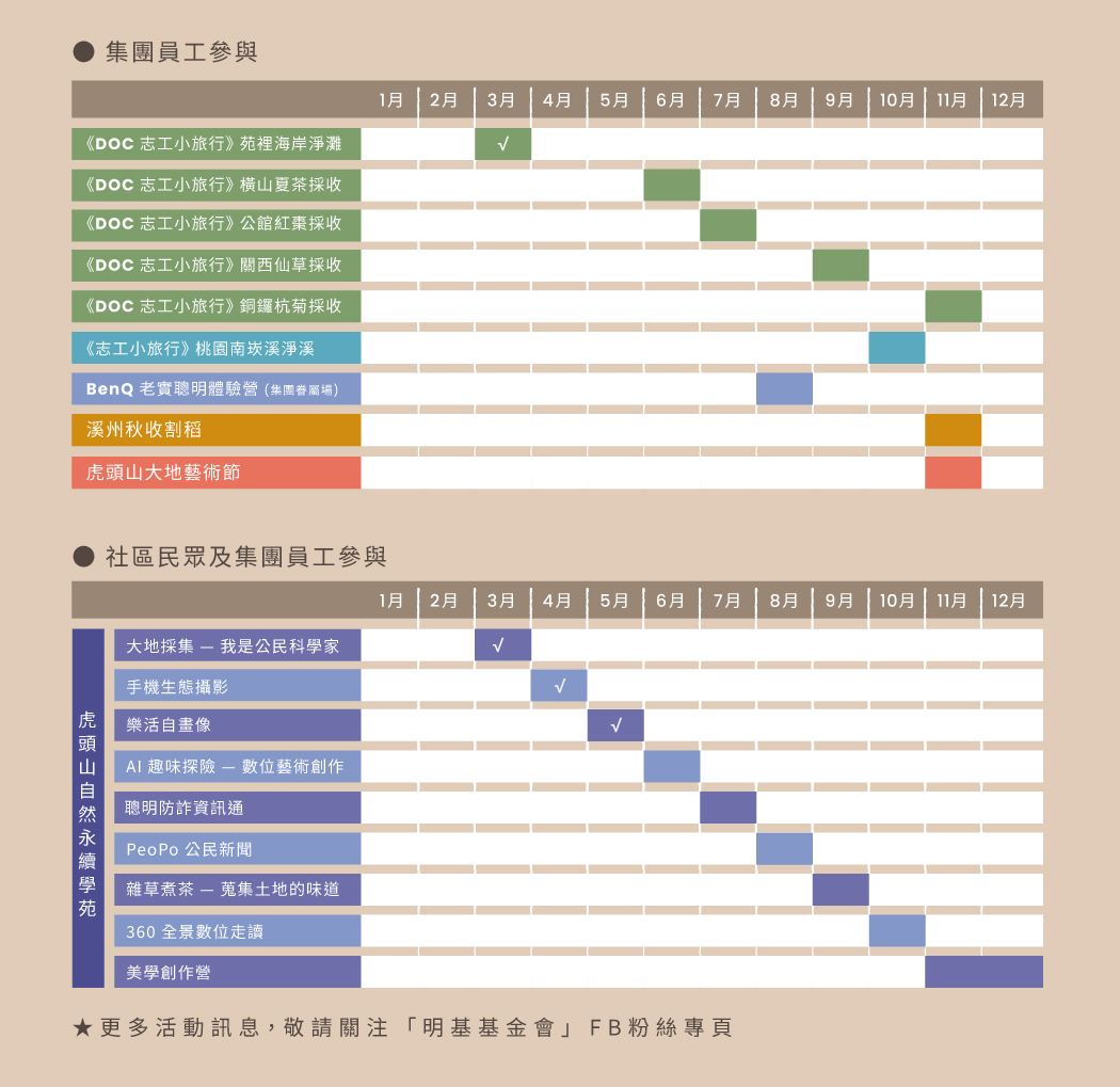 從田野到溪畔,跟著「志工小旅行」參與環境守護行動;盛夏的「BenQ老實聰明體驗營」,陪伴孩子展開一場科學×人文的學習探索;「溪州秋收」彎腰割稻,體會自然之美與善耕價值;「虎頭山自然永續學苑」開設數位素養、人文藝術等多元課程,串連社區與企業共學共創;「虎頭山大地藝術節」壓軸登場,藝術家以循環素材現地創作,結合農學市集與創意展演,於創新園區打造永續美學。